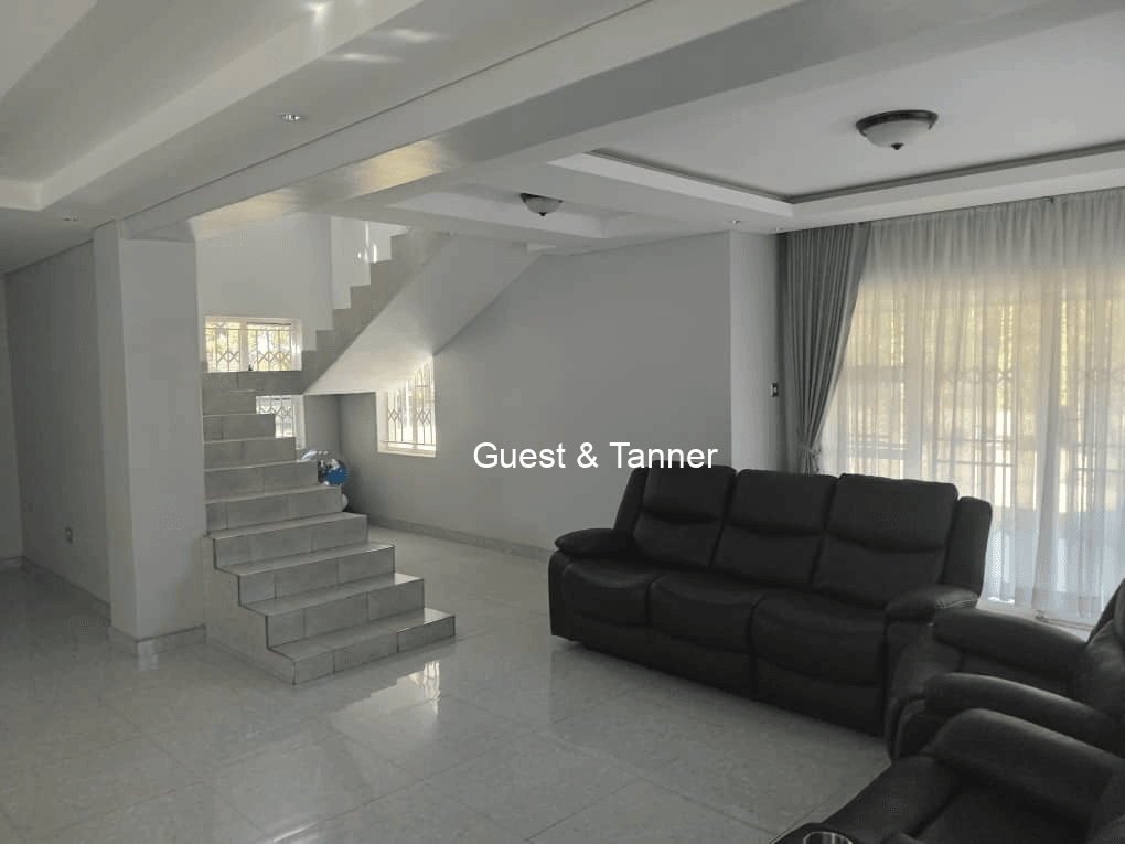 A beautiful and newly renovated 5 bedroomed house in a very quiet and neighbourhood. The ground floor features a modern fitted kitchen , a dining room, 3 bedrooms and a spacious lounge. A staircase up the property features a small dining room, a kids bedroom and the main bedroom with an ensuite and walk in closet. It is ornamented with a functional pool,a borehole and a very spacious yard.It also comes with a three roomed cottage, single lockup garage as well as a 2 bedroomed staff quarters.The property is sitting on 4256Sqm.